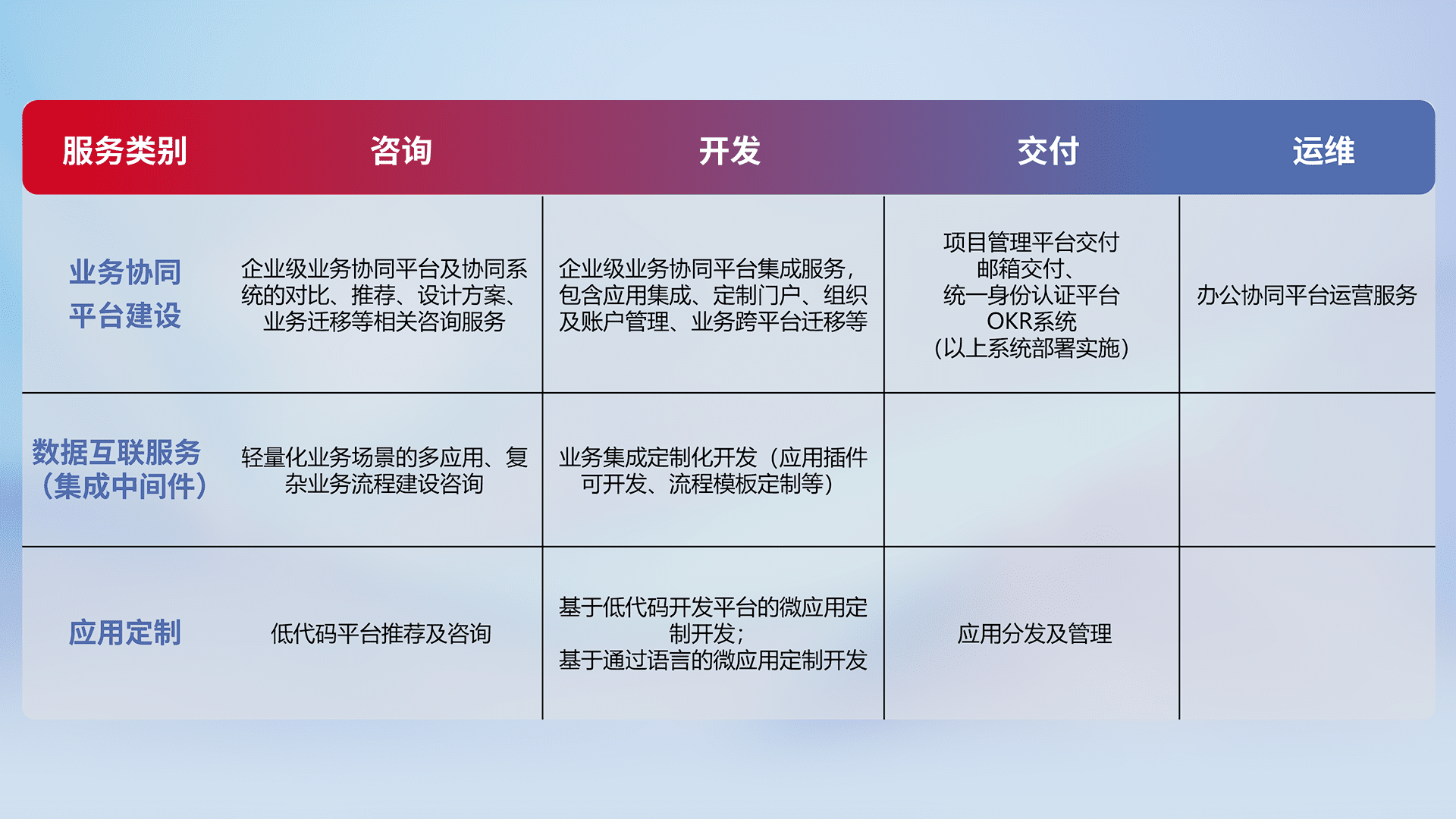 针对钉钉、、、企微、、、、IDaas等平台级产品提供产品的规划、、、、方案、、、、交付、、、定制化开发等服务,,,,实现如统一协同办公、、智能客户服务、、、混合会议管理、、、、智能数据查询、、等业务场景,,实现数字化转型。。。。