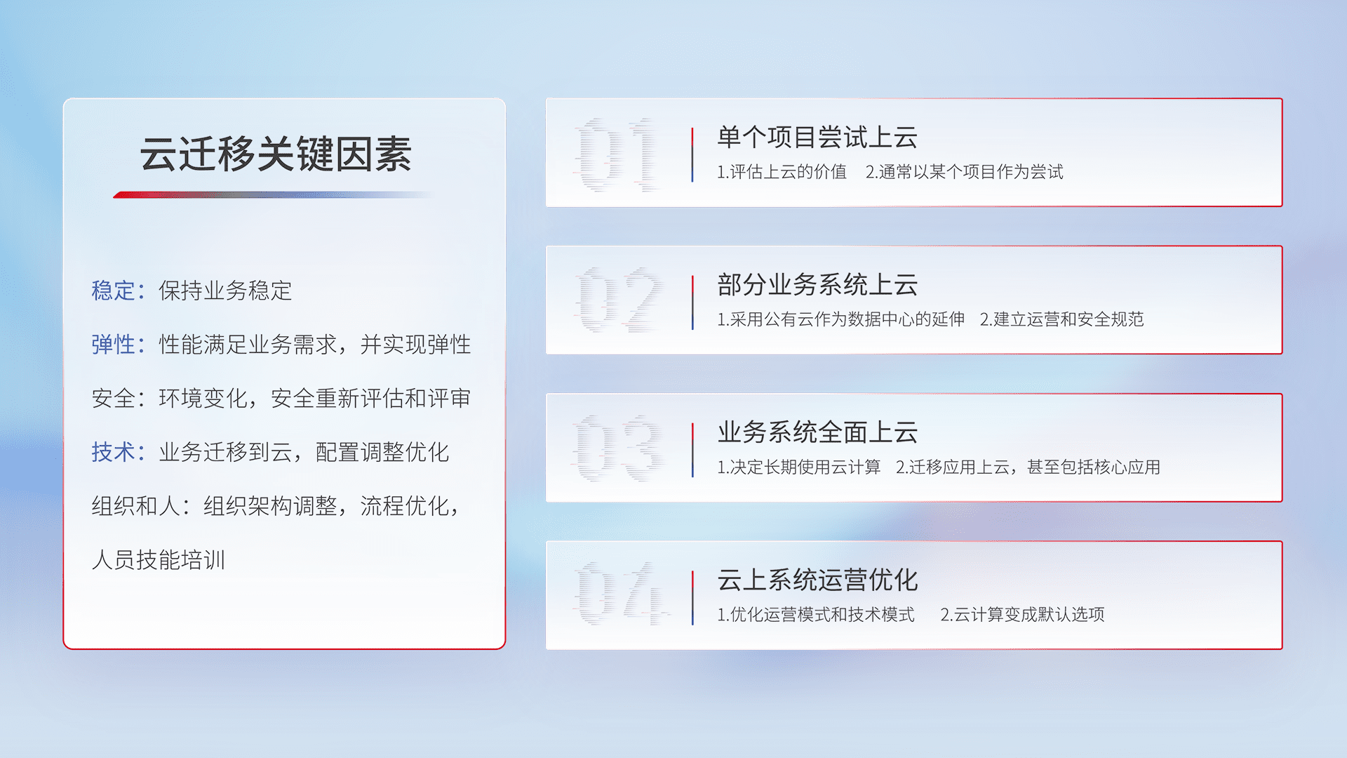 结合实际业务,,,从规划设计、、、云平台选型、、、云原生改造、、、、数据迁移、、、集成交付,,,,迁移全过程为客户识别最佳上云路径,,,做好风险识别管理,,,,设计网络架构、、身份权限、、安全审计合规、、、、操作审计、、、日志审计、、、、监控告警策略、、、、多站点容灾设计等,,对云上基础设施进行整体规划,,,,提升IT治理水平,,,,以满足弹性、、、高可用、、、高性能的需求。。。